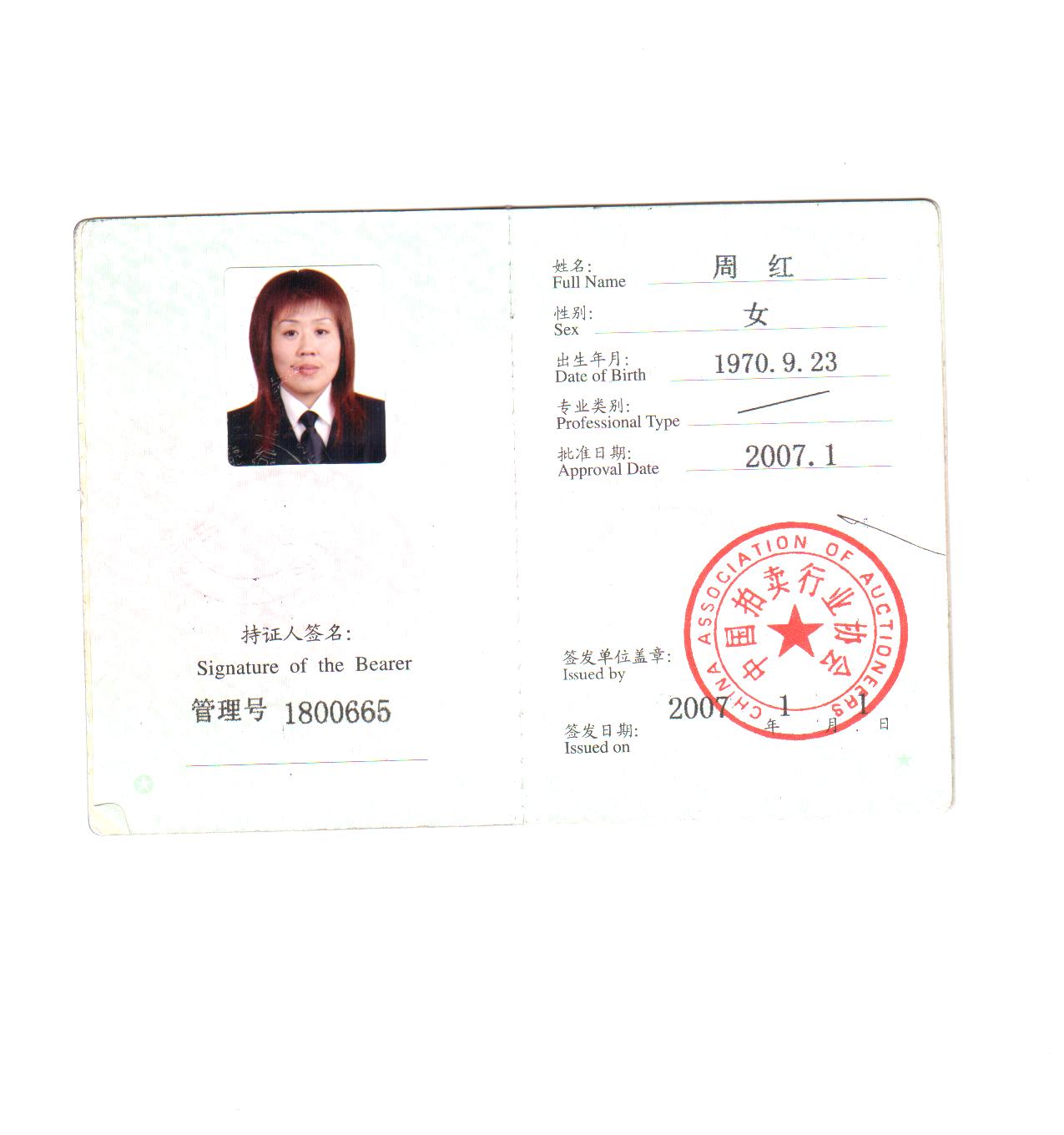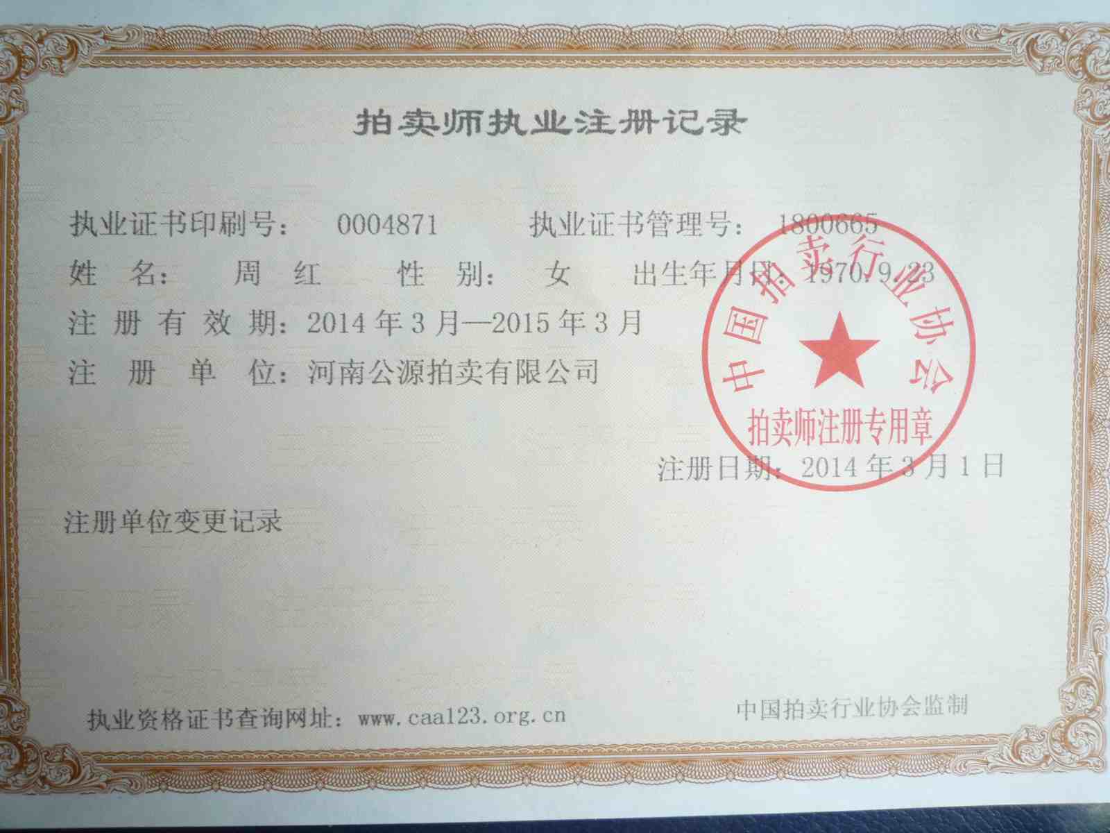 國家注冊拍賣師周紅執(zhí)業(yè)資格